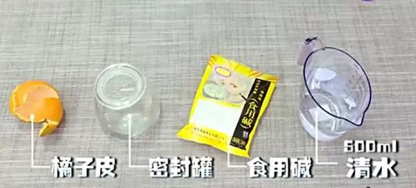 2、往橘皮水里加入2小勺食用堿,用筷子攪拌均勻。把密封罐的蓋子蓋緊,放到冰箱里冷藏2——3天,讓橘子皮里的里的香精油充分散發(fā)出來。