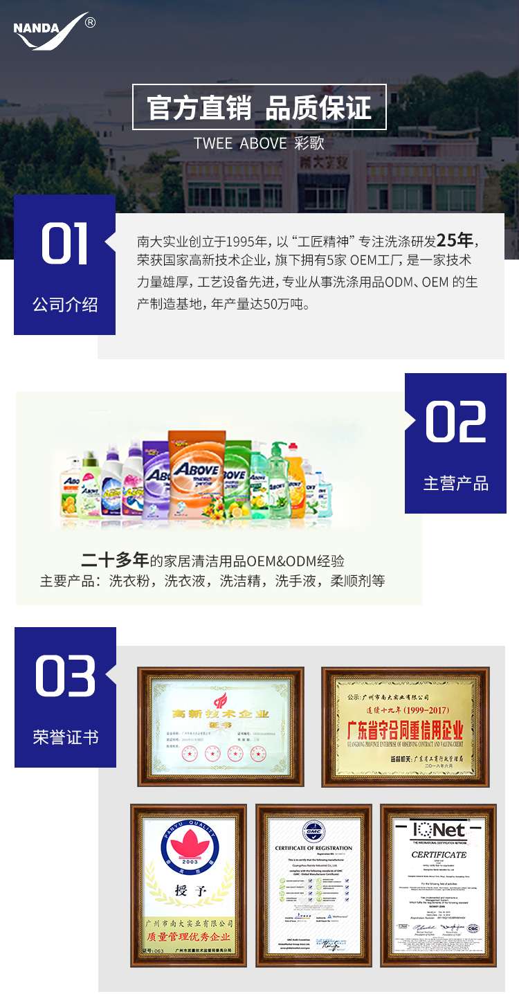 廣東南大集團(tuán)股份有限公司創(chuàng)立于1995年,以日化制 造為主,有著三十年以上行業(yè)服務(wù)經(jīng)驗(yàn)和口碑。榮獲國家高新技術(shù)企業(yè)、廣州市科技創(chuàng)新小巨 人企業(yè)等稱號(hào)。是一家技術(shù)力量雄厚,工藝設(shè)備先進(jìn), 專門從事洗滌用品ODM、OEM的生產(chǎn)制造基地,生產(chǎn)經(jīng)營 產(chǎn)品有衣物洗滌類、衣物護(hù)理類、洗潔精類、家居清潔 類等 。