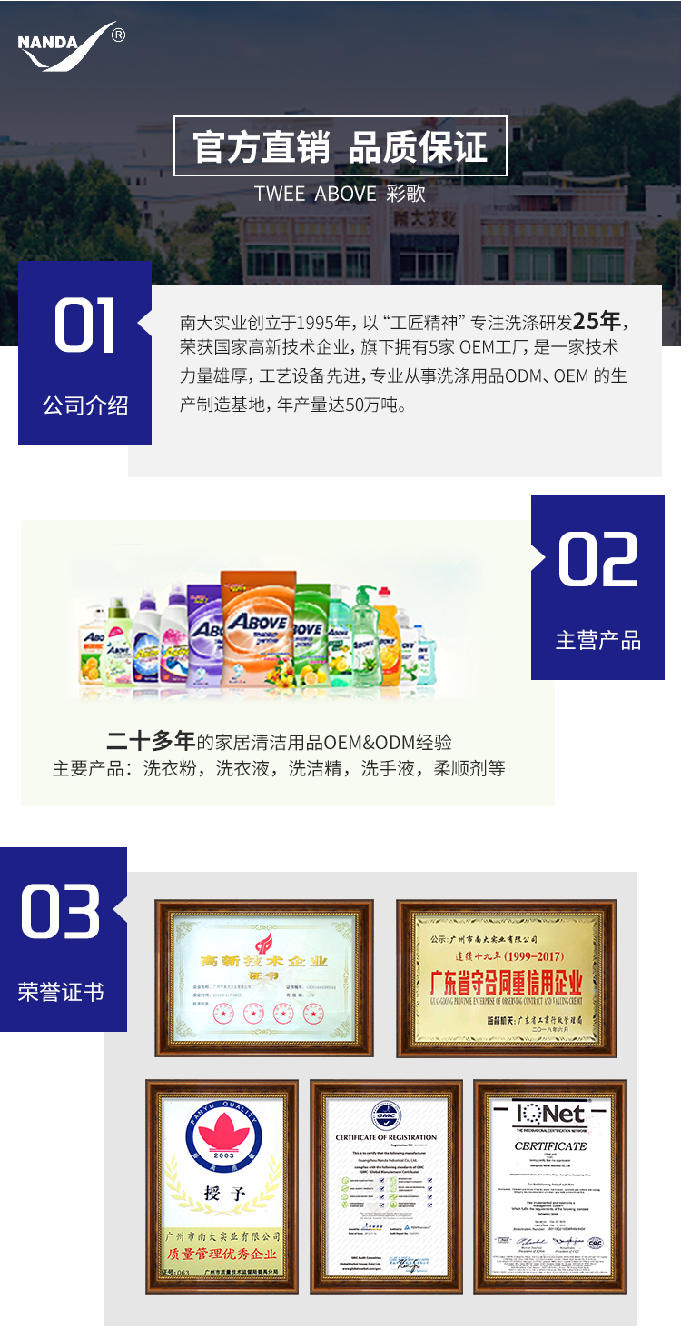 廣東南大集團(tuán)股份有限公司創(chuàng)立于1995年,以日化制 造為主,有著三十年以上行業(yè)服務(wù)經(jīng)驗和口碑。榮獲國家高新技術(shù)企業(yè)、廣州市科技創(chuàng)新小巨 人企業(yè)等稱號。是一家技術(shù)力量雄厚,工藝設(shè)備先進(jìn), 專門從事洗滌用品ODM、OEM的生產(chǎn)制造基地,生產(chǎn)經(jīng)營 產(chǎn)品有衣物洗滌類、衣物護(hù)理類、洗潔精類、家居清潔 類等 。